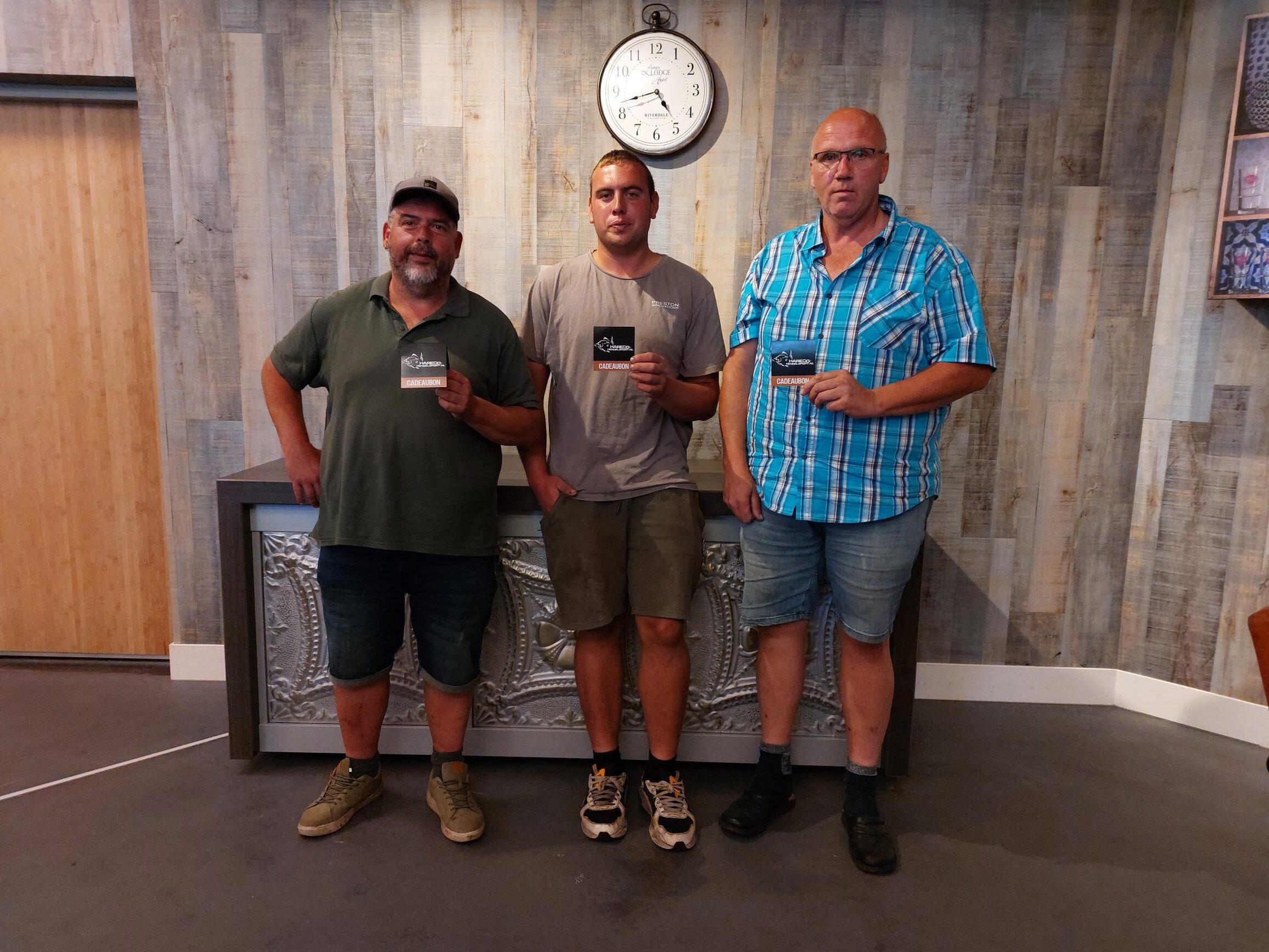 Hier hebben we drie kanjers staan die alle drie boven de 10 kilo gevangen hadden. Maar wie gaat vandaag met de eer strijken, dat was de grote vraag. Winnaar Mathieu Klop die er net nog wat verder bovenuit stak met 12370 gram en de eerste prijs won, wat een klasse, de 2e en 3e prijs was heel spannend bij de weegschaal, wie o wie heeft het geluk en dat was vandaag voor Patrick de Ruiter met de 2e prijs en een vangst van 10330 gram, Erik van Genderen was vorig jaar 2e en moest nu de genoegen nemen met de 3e prijs en een vangst van 10240 gram.